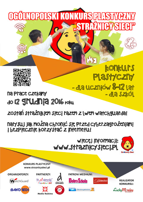 Serdecznie zapraszamy uczniów naszej szkoły do udziału w Ogólnopolskim konkursie plastycznym „Strażnicy Sieci” . Konkurs kierowany jest do uczniów wieku 8-12 lat. ZADANIE KONKURSOWE Zadaniem jest wykonanie pracy plastycznej w formie płaskiej, wykonanej w dowolnej technice manualnej (malowanka, wydzieranka, wyklejanka, rysunek, itp.) w formacie A4. Temat pracy konkursowej powinien nawiązywać do poniższych motywów tematycznych: - wybranego/wybranych zagrożeń czyhających w Sieci, - Czerwonego Lwa jako strażnika bezpieczeństwa w Sieci. Wg hasła: Z Lwem Watchguarda jestem bezpieczny w Internecie, - Nazwy konkursu „Strażnicy Sieci” i sposobu w jaki można chronić siebie i swoich rówieśników przed zagrożeniami płynącymi z Internetu. Prace należy składać do dnia 9 grudnia 2016 roku u Pani Potysz.